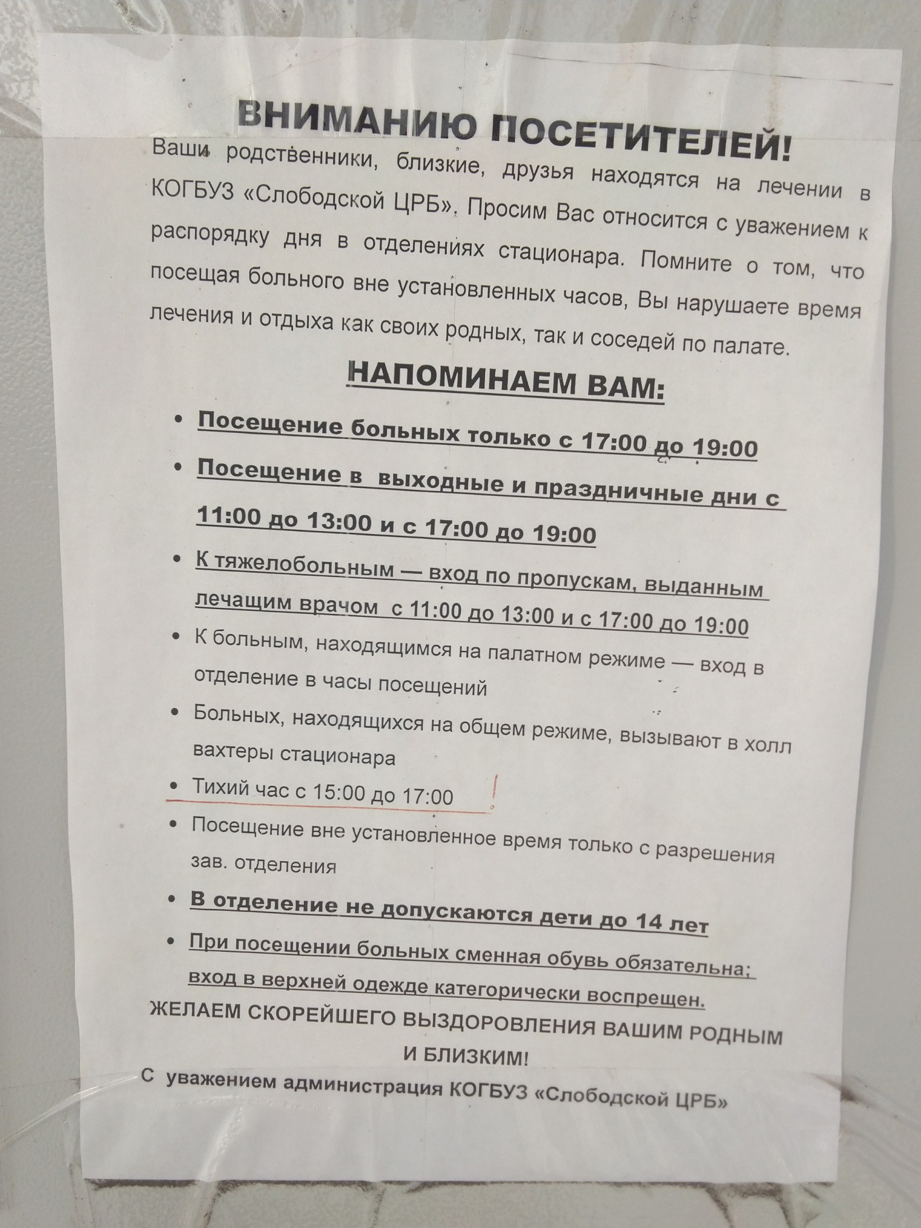 • Посещение больных только с 17:00 до 19:00;